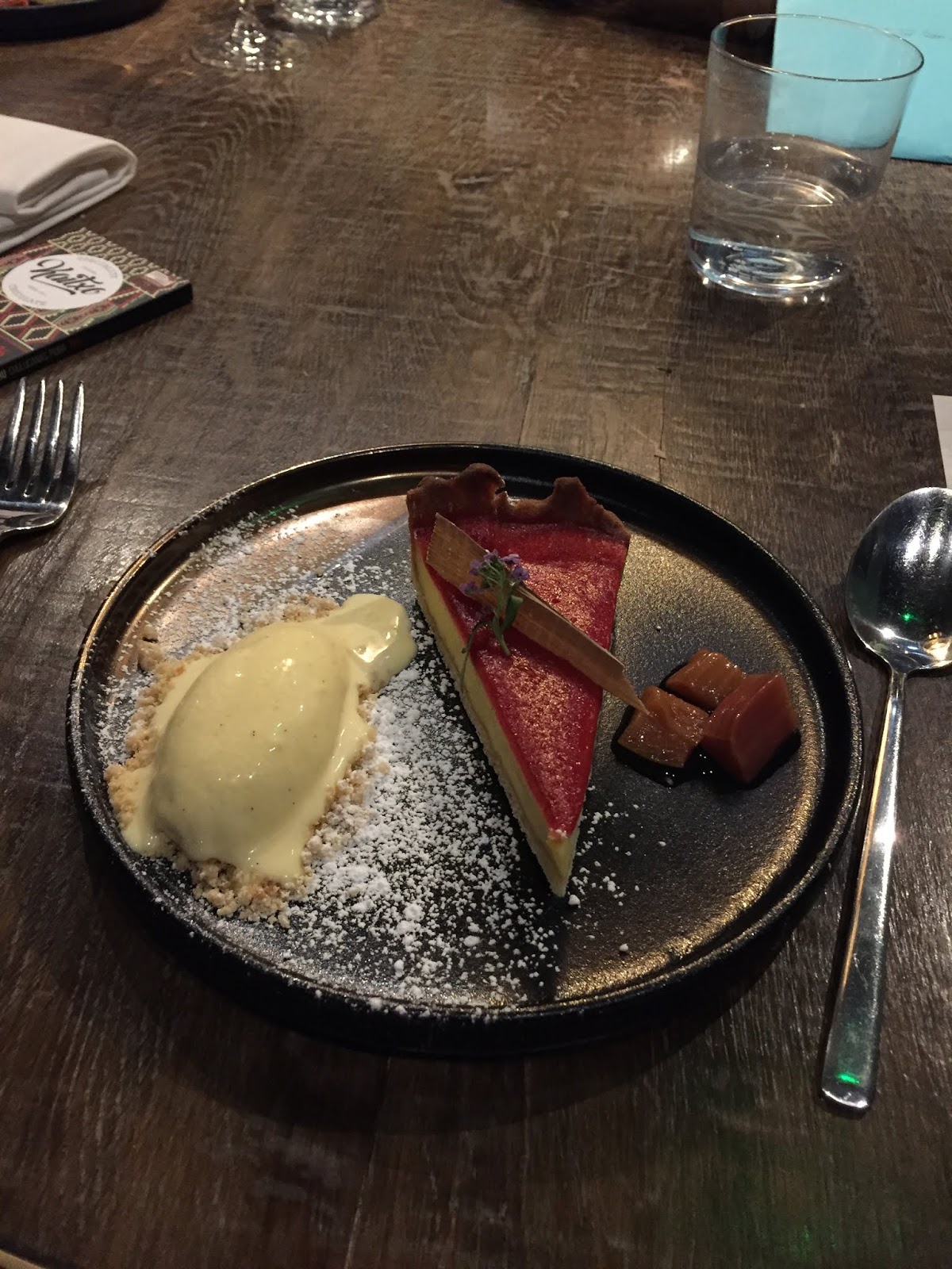 | Rhubarb & Custard Tart, Rhubarb Gel, Vanilla Ice Cream |